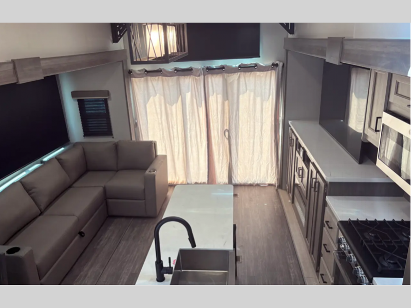 A seamless roof membrane, full length frame E-coated outriggers, and 2' x 3' floor joists on approximately 12" centers with horizontal support studs hold these units together. The water heater by-pass winterization kit helps extend your camping season, and you will love the smooth aluminum radius front for a sleek look. You'll love the GE kitchen appliances and carpet-free interior for easy cleaning, plus there is a JBL entertainment package to wash away those rainy-day blues!