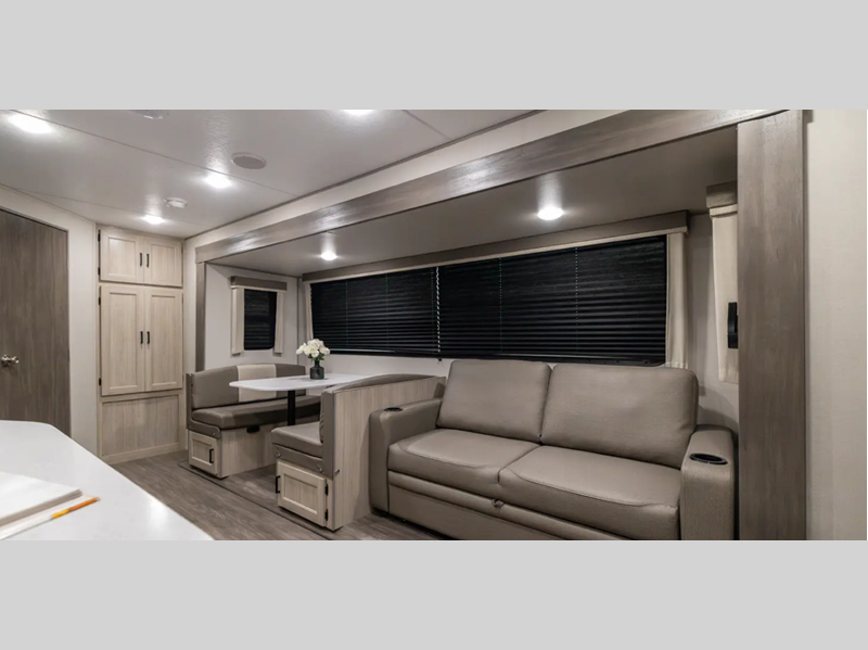 Sleeps 5 Slides 2 Length 29 ft 4 in Ext Width 8 ft Ext Height 11 ft 1 in Int Height 6 ft 9 in Hitch Weight 854 lbs GVWR 9654 lbs Dry Weight 6977 lbs Cargo Capacity 2677 lbs Fresh Water Capacity 44 gals Grey Water Capacity 60 gals Black Water Capacity 30 gals Furnace BTU 35000 btu Available Beds RV Queen Refrigerator Type Stainless Steel GE 12V Refrigerator Size 10.7 cu ft Cooktop Burners 3 Shower Size 34" x 34" Number of Awnings 1 LP Tank Capacity 20 lbs Water Heater Type Tankless AC BTU 15000 btu Awning Info 18' Electric w/Multicolor Lights and Remote Axle Count 2 Number of LP Tanks 2 Shower Type Radius Similar Floorplans