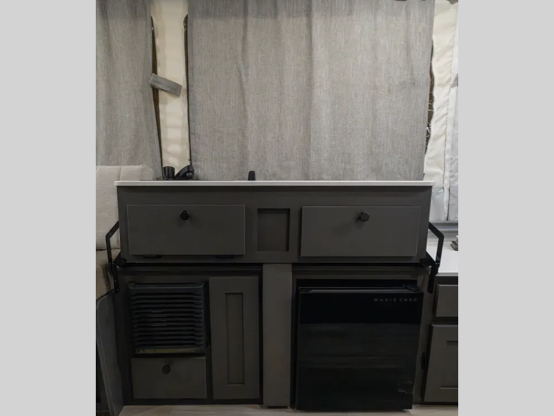 Sleeps 6 Slides 1 Length 16 ft 10 in Ext Width 7 ft Ext Height 5 ft 6 in Interior Color Autumn Wood Exterior Color Gray Hitch Weight 263 lbs Dry Weight 2458 lbs Cargo Capacity 805 lbs Tire Size 13" Furnace BTU 20000 btu Available Beds Two Tent End Refrigerator Type 12V w/100W Roof Solar Panel Refrigerator Size 1.7 cu ft Cooktop Burners 3 Number of Awnings 1 LP Tank Capacity 20 lbs Awning Info 10' 6" with LED Lighting Axle Count 1 Number of LP Tanks 2 Electrical Service 30 amp Open Length 23 ft 11 in -